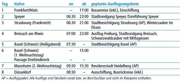 Es duftet verführerisch nach Glühwein und Lebkuchen, Schneeflocken tanzen durch die Straßen und funkelndes Licht erleuchtet die mit Eisblumen verzierten Fenster. Freuen Sie sich auf eine Festtagsstimmung, die ihresgleichen sucht und feiern Sie das Weihnachtsfest in zauberhafter Atmosphäre an Bord von MS LADY CRISTINA. Geschmückte Häuser an den Ufern und das Winterkleid des Schwarzwalds – hier entdeckt jeder seine eigene Weihnachtsgeschichte!